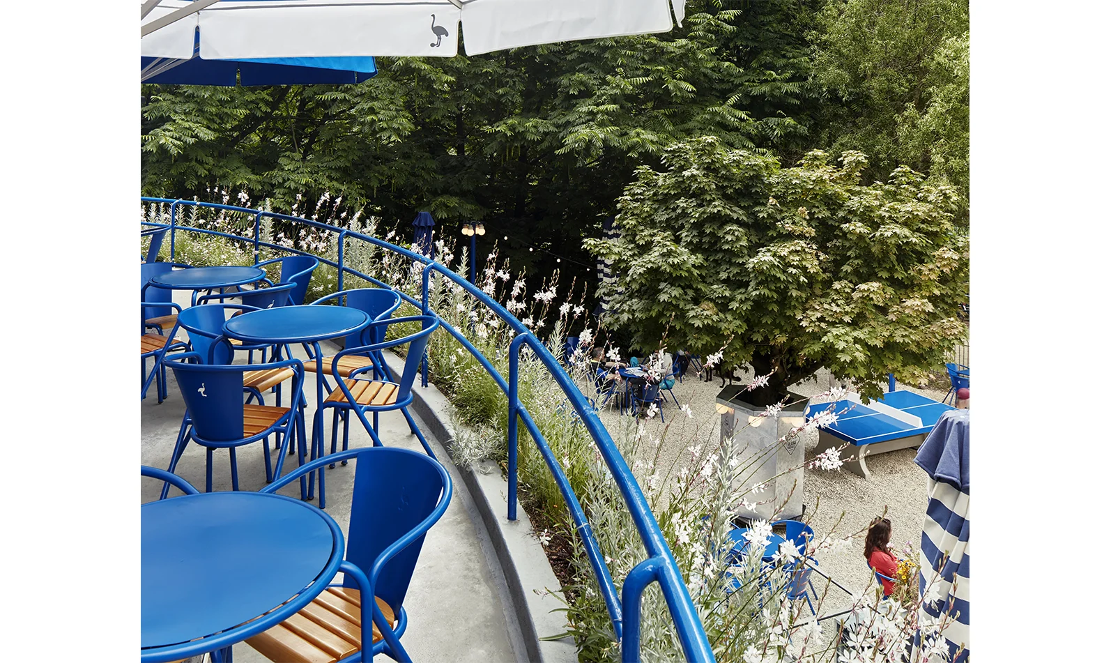 To enforce the unique character of the location, Studio Modijefsky also sourced a special type of outdoor steel chair and lounger, never before used in Amsterdam. The monumental inky shade of blue, so characteristic for Blauwe Theehuis is combined with a small, white Brouwerij ‘t IJ logo of an ostrich, forming a new identity reminiscent of Parisian parks.